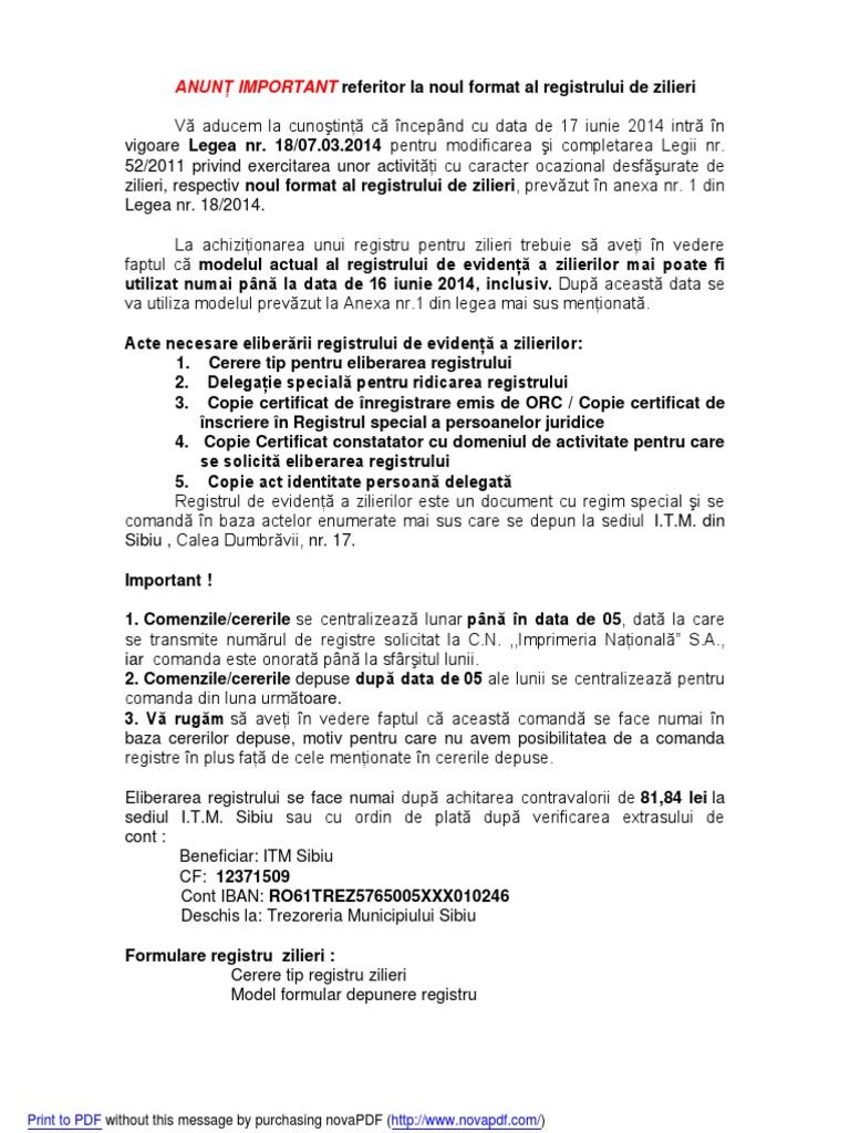 Din 17 06 2014 Un Nou Model De Registru Pentru Zilieri AtenÅ£ie Se ProcurÄ De La Itm Vechile Modele Nu Mai Sunt Valabile Costyabc Hatzegworld Source from : https://costyconsult.wordpress.com/2014/06/18/din-17-06-2014-un-nou-model-de-registru-pentru-zilieri-atentie-se-procura-de-la-itm-vechile-modele-nu-mai-sunt-valabile/ Registrul pe hartie al zilierilor va fi inlocuit cu un sistem electronic, in maxim 3 luni. Am promis ca verific, am vorbit la inspectoratul teritorial de munca si vin cu un raspuns, in premiera: Persoanele care utilizează zilieri pentru diferite activități cu caracter temporar vor fi obligate, începând de sâmbătă, 25 iulie 2020, să renunțe la registrele clasice și să înregistreze activitatea prestată de lucrători în registrul electronic, anunţă ministerul muncii. Download formular model de cerere itm pentru eliberare registru zilieri in format pdf, word, doc,. Legea aduce posibilitatea ca transmiterea sa se faca si in format electronic.