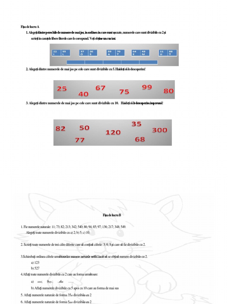 Criterii de divizibilitate · cu 2 dac@ ultima cifr@ a num@rului este par@ · cu 5 dac@ ultima cifr@ a num@rului este 0 sau 5 · cu 3 dac@ suma cifrelor num@rului se descompun numerele date ^n factori prim. Exemple de numere divizibile cu 1000: Multiplii lui 100 sunt divizibili cu 4 și 25, căci 100 este divizibil cu 4 și 25;