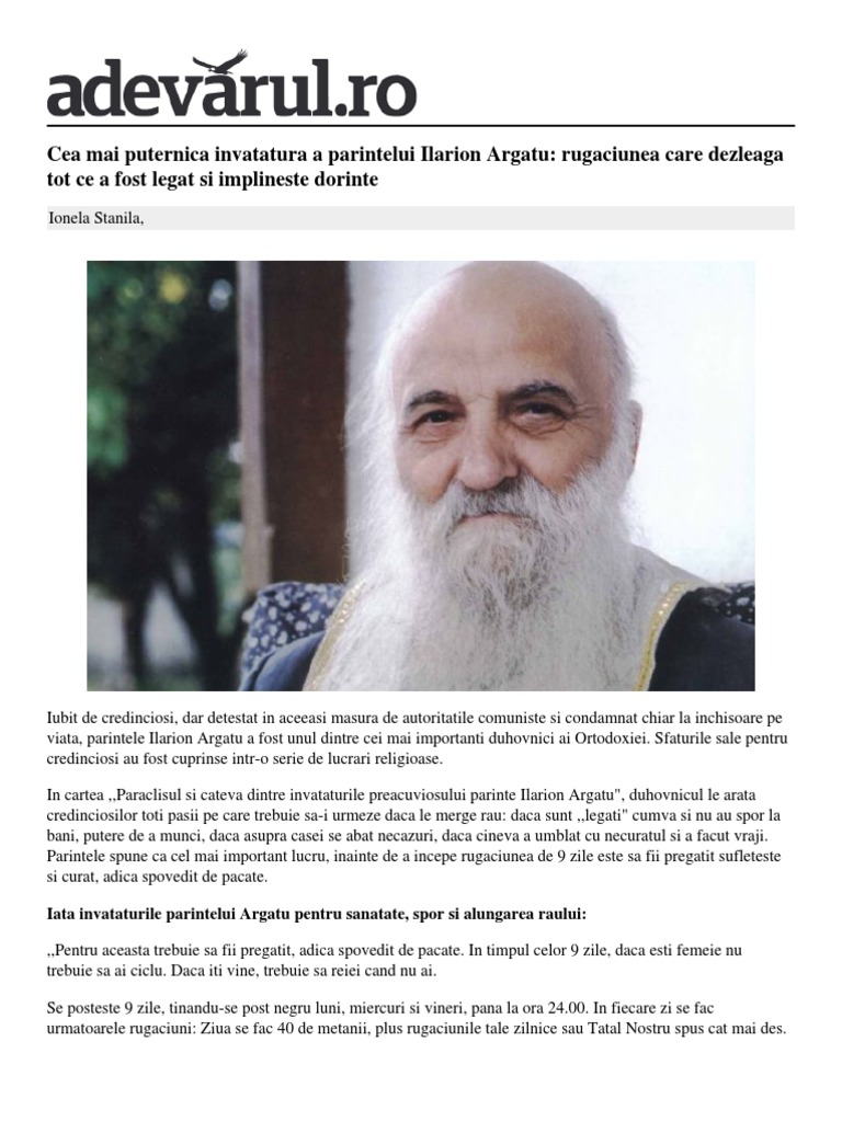 Cunoscutul părinte ilarion argatu a lăsat o rugăciune care să te ferească de astfel de probleme. Parintele ilarion argatu, fiind copil al devotajilor lui paring pentru iisus hristos §i sfanta biserica, alexandru §i maria, a fost trimis de mama sa sa aduca o oala de lapte prins de la o vecina care statea. Îmi vine în minte un exemplu povestit, nu întâmplător, din bogata experienţă a sfinţiei sale, de venerabilul părinte vasile argatu, tată a 15 copii, frate cu părintele ilarion: